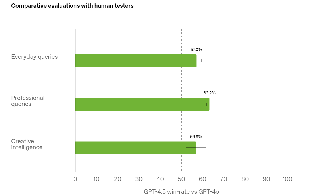人間がGPT-4oとGPT‐4.5の回答を比較した際の、それぞれの項目での勝率は以下のようになっています。