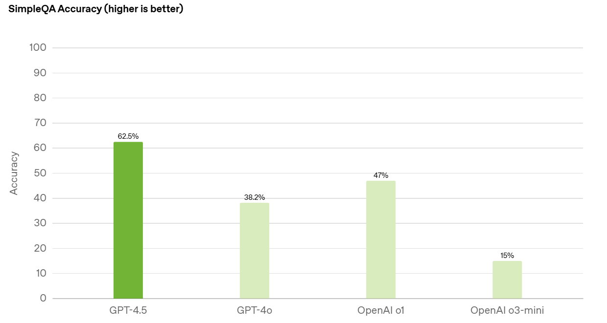 さらに、SimpleQAをはじめとするベンチマークテストでも高い正答率を記録し、広範囲な分野で優れた性能を発揮しています。特に、STEM分野に特化したo3-miniには劣る部分もあるものの、総合的な質問応答能力では前身モデルを超える結果を示しており、専門的な質問への対応力も向上しています。