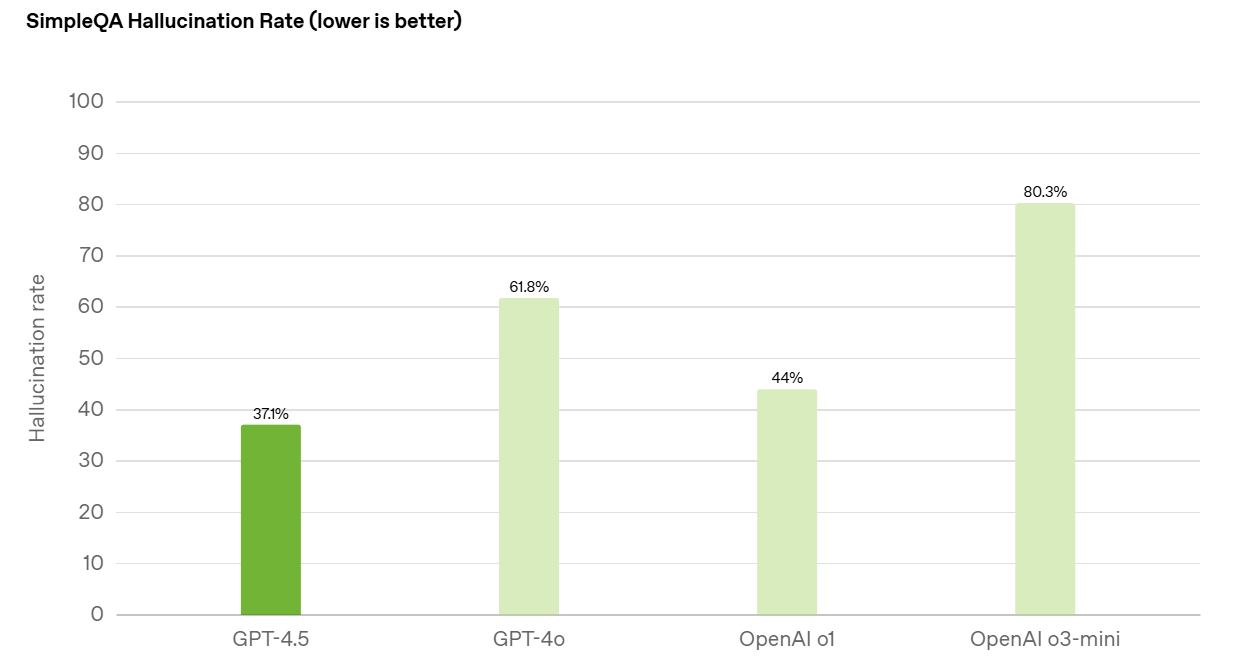 Open AI o1が44%とかなり低い値を出しているもののChat GPT 4.5は37.1%とそれを凌駕する数字を記録しています。