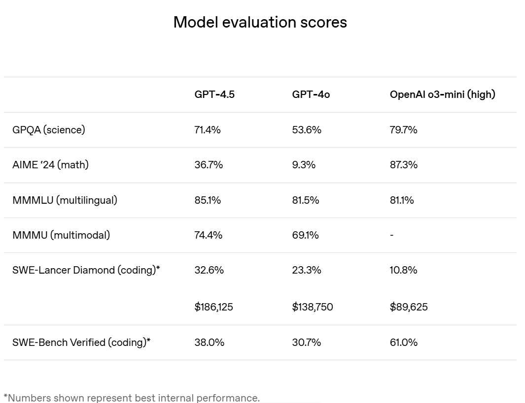 数学・科学・コーディングなどのSTEM分野のベンチマークではo3-miniより低いスコアを記録しているものの、広範囲な出題内容で総合力の問われるMMMLUやMMMUでは前身モデルをしのぐスコアを記録しています。先ほど述べた教師なし学習の強みである、現実的な問題への回答能力が向上していることがここからもわかりますね。