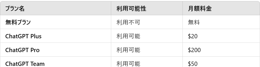 Chat GPT 4.5は公開当初Proプランのみ利用可能だったのですが、順次PlusとTeamプランでも利用が可能となりました。各プランの月額料金は以下の表の通りです。無料では利用することができないため、試されたい方はChatGPTの有料プランにご加入ください