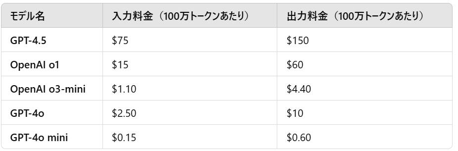 Chat GPT 4.5も他のAIモデルと同様にAPIが存在しますが、下の表からもわかるように価格設定がかなり異なっています。Chat GPT 4.5は大規模なモデルであるため計算コストもかかってしまい、この価格設定になったことが考えられます。