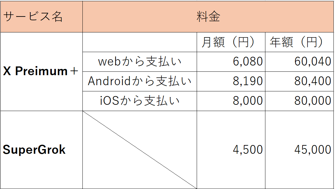 現在、Grok 3は無料でも公開されているためGrok公式サイトやSNSであるXのWebやアプリからも利用することができるが、Deep searchやThink機能の使用回数などの制限が見受けられます。そんな制限を取り払ってGrok 3を利用するためには、Xの有料プランである「X Preimum+」またはGrokの有料プランである「SuperGrok」を契約する必要があります。各サービスの料金は以下の通りです。