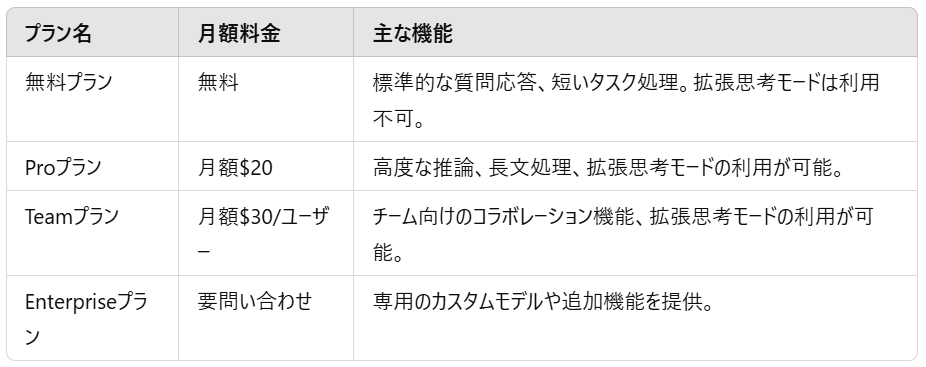 Claude 3.7 Sonnetは無料で利用することもできますが利用回数に制限があります。Claudeの有料プランに加入することで制限を気にすることなく利用することができます。また、拡張思考モードはPro以上のプランに入らないと利用することができないのでご注意ください。料金は以下の通りです。