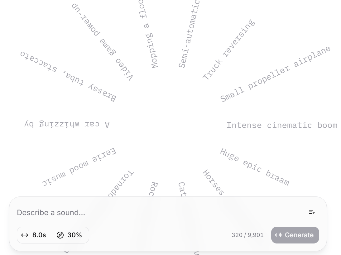 こちらは音声生成に特化したAIツールの中でも非常に革新的な機能です。この機能を利用することで、音声合成だけでなく、入力したテキストに沿った効果音や背景音なども加えることができ、コンテンツに臨場感や深みを加えることができます。