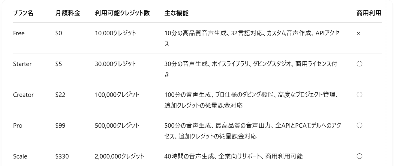 ElevenLabsの料金プランは、個人ユーザーから企業まで、さまざまなニーズに対応する複数のオプションが用意されています。以下の表に、各プランの月額料金、利用可能なクレジット数、主な機能、商用利用の可否をまとめました。