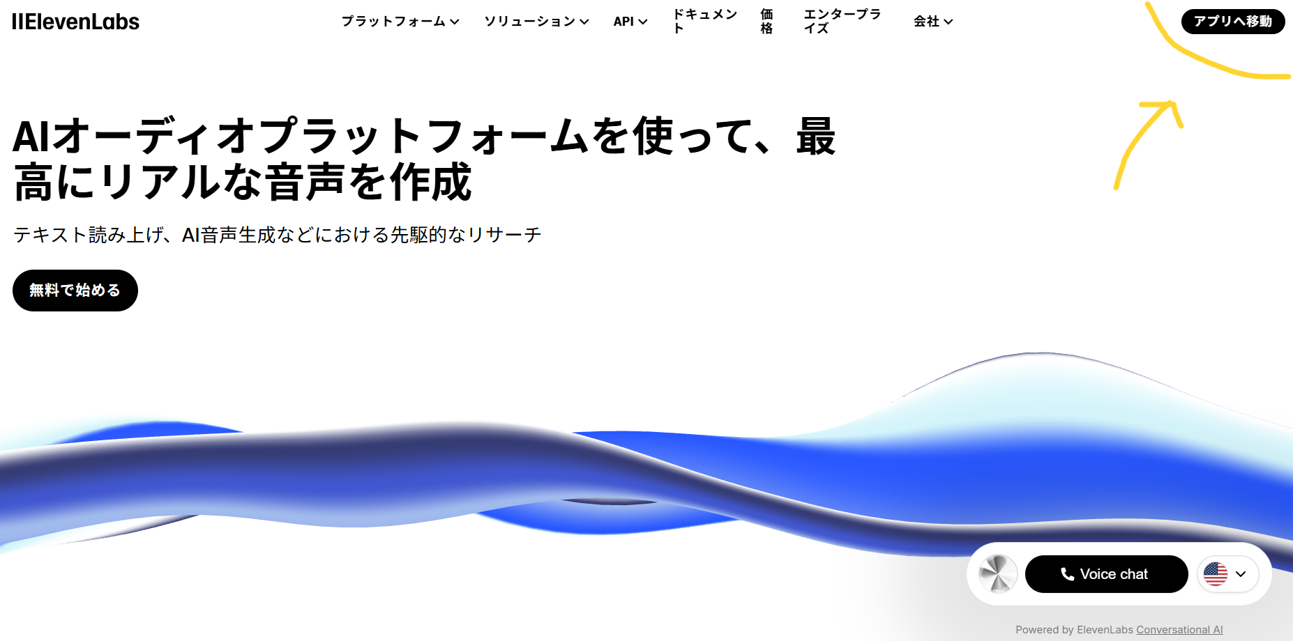 まずElevenLabsの公式サイトを訪れて、右上の「アプリへ移動」をクリックします。