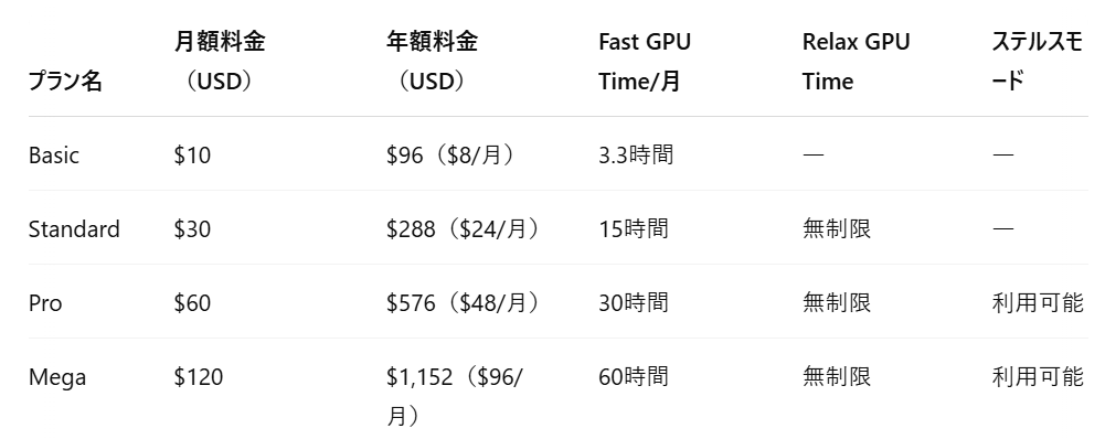 料金プランは複数あり、個人ユーザー向けから商用利用を想定したものまで幅広く用意されています。最も安価なプランでは、月額10ドル前後で一定数の生成回数が含まれており、画像生成の練習や個人使用には十分なボリュームです。一方、商用利用を前提とする場合や、生成回数を気にせず使いたい場合には、より高価格のプラン(月額30ドル〜60ドル以上)が推奨されます。