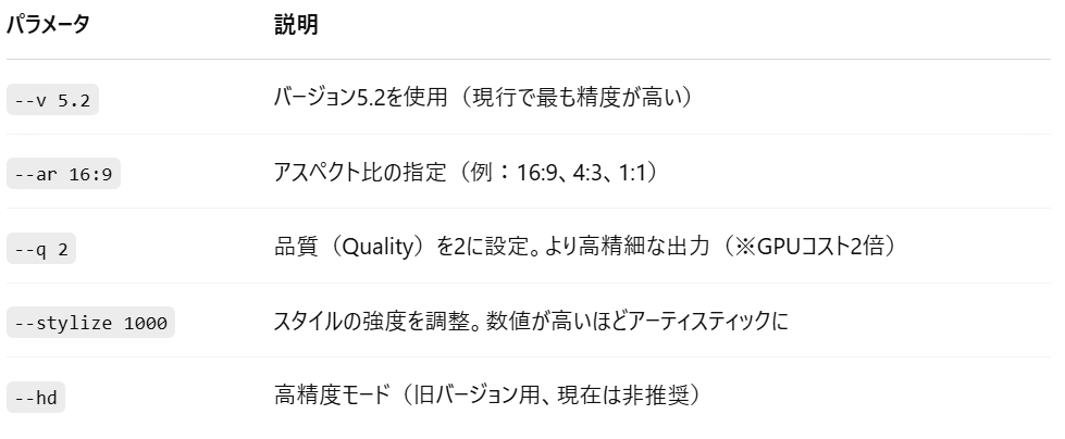 Midjourneyにはプロンプトに付け加える「パラメータ」があり、画像の品質や詳細さを調整できます。